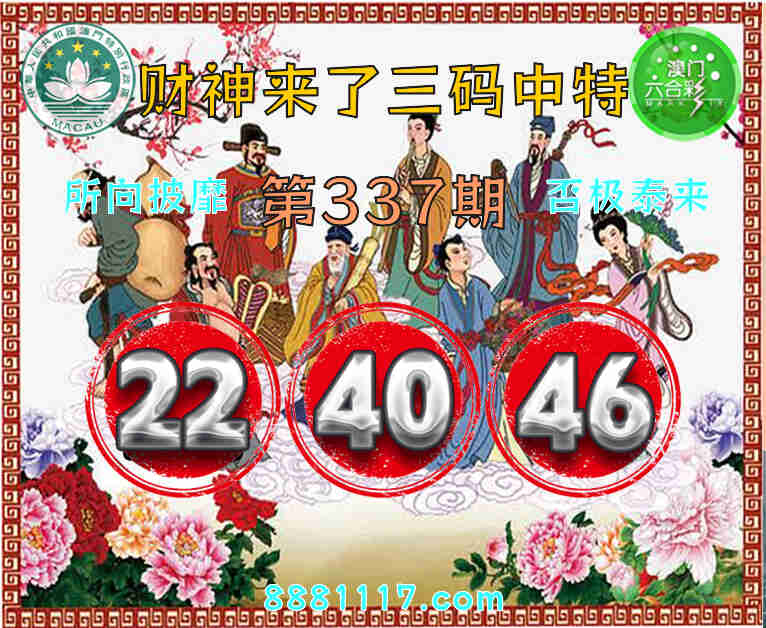 337期: 🥉『财神来了』 🥉三码中特🥉【22.40.46】开:09
